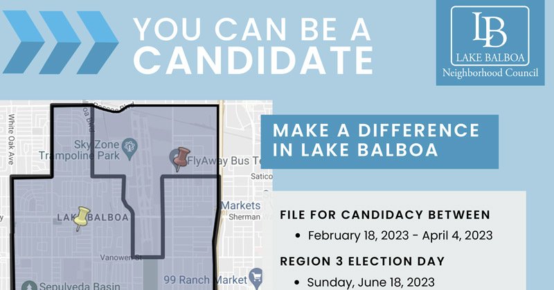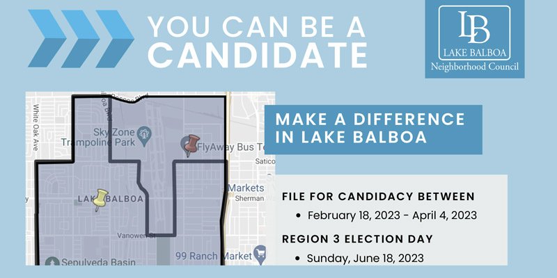 For details on your Neighborhood Council election and how you can become a candidate for office on your neighborhood council, visit LakeBalboaNC.org, and click MORE on Neighborhood Council Elections.