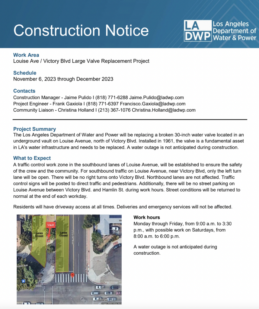 Louise Ave./Victory Blvd Large Valve Replacement Project November 6, 2023 – December 2023