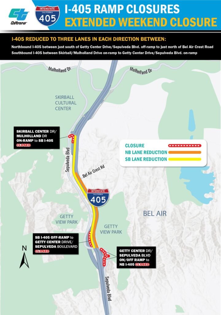 Caltrans announced extended weekend lane reductions along Interstate 405 (I-405) through the Sepulveda Pass. The freeway will be reduced to three lanes in each direction and motorists are strongly encouraged to seek alternate routes and explore public transportation options to reach their destinations.